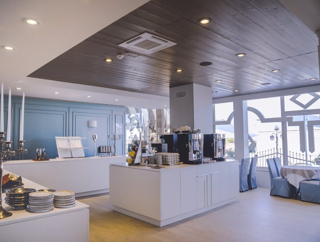 All’interno si trova la grande sala dove poter fare colazione, servita a buffet tutte le mattine, con una grande vetrata da cui si vede il mare.